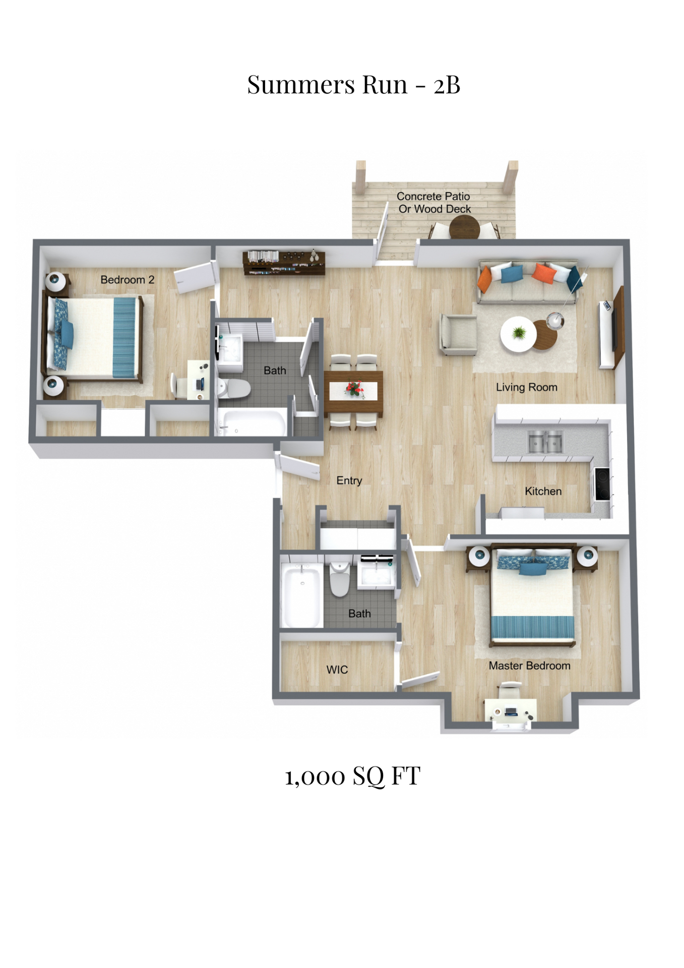 Expansive and well-appointed two-bedroom apartments spanning 1,000 square feet, featuring two full bathrooms. These residences boast LVP flooring, stainless steel appliances, contemporary light fixtures, and stylish countertops.